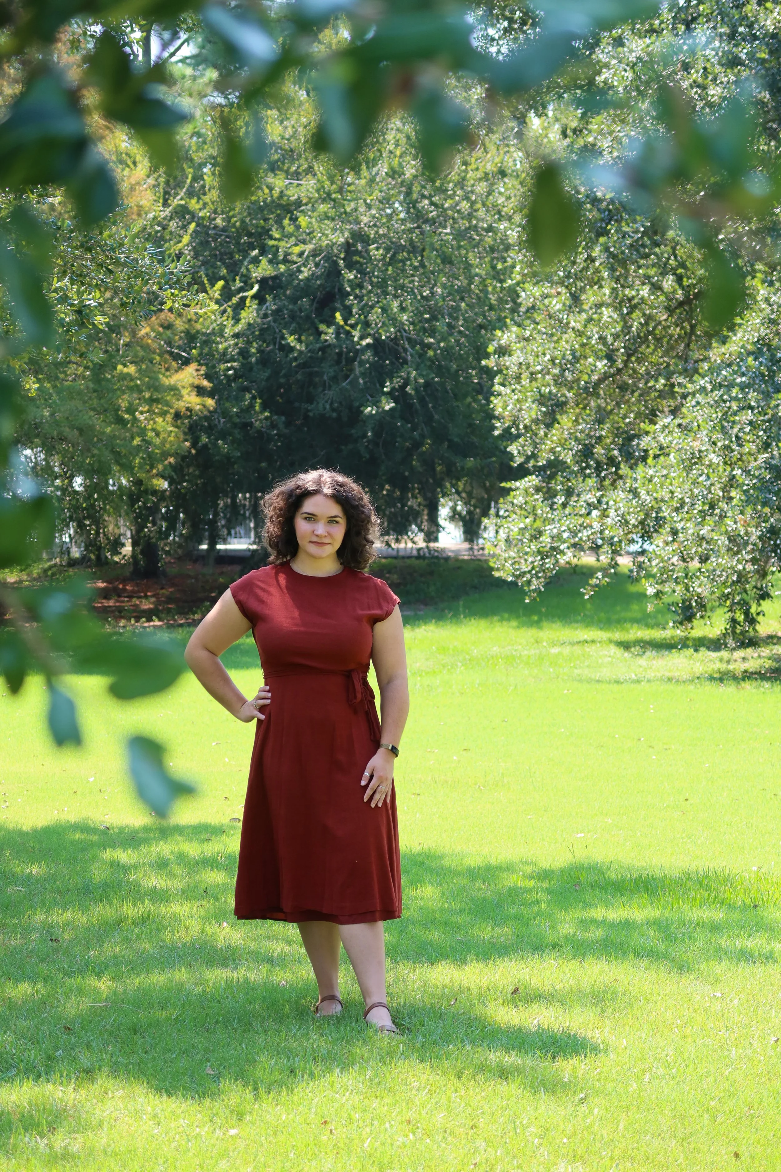 Young woman in a red dress standing on a grassy lawn, surrounded by trees and foliage in a park on a sunny day.