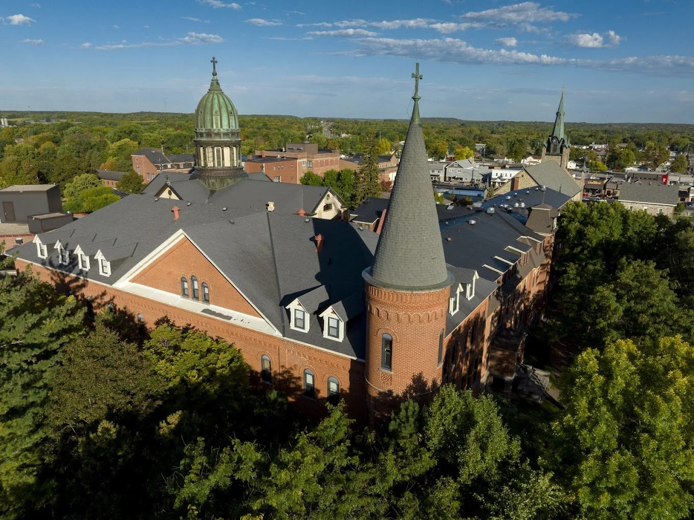 Aerial view of a historic brick church with multiple steeples and a domed tower, surrounded by green trees and a small town.