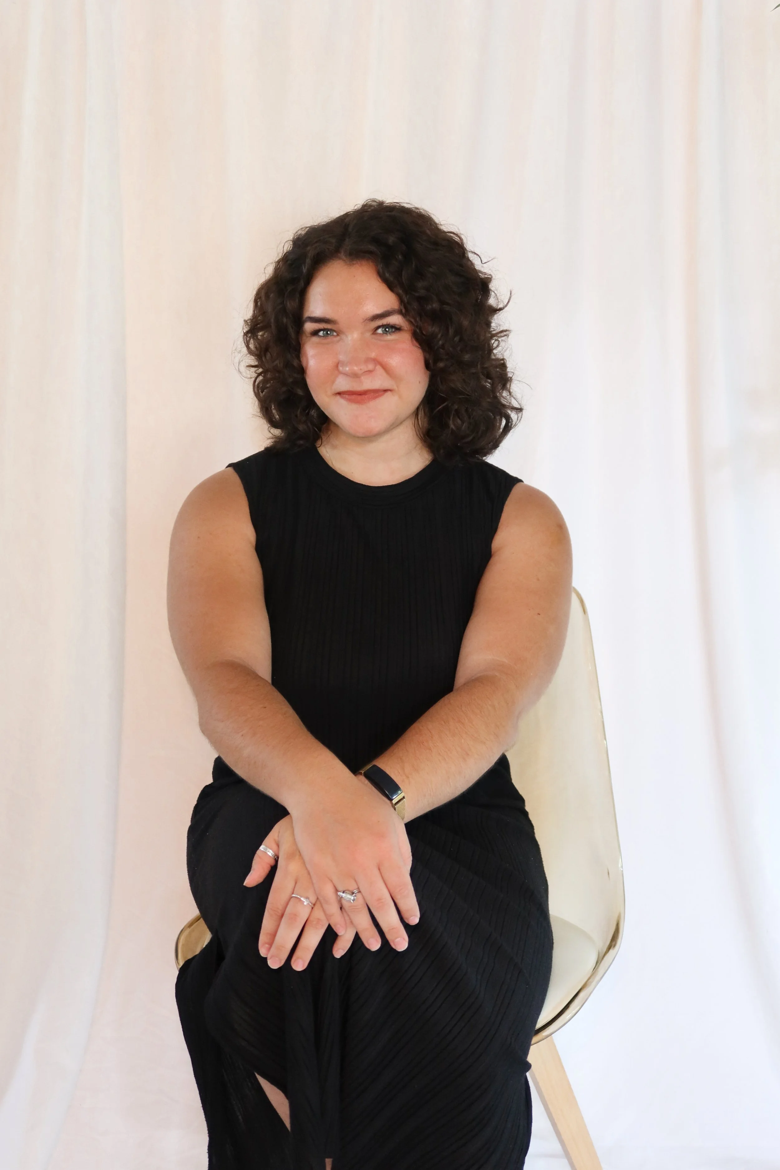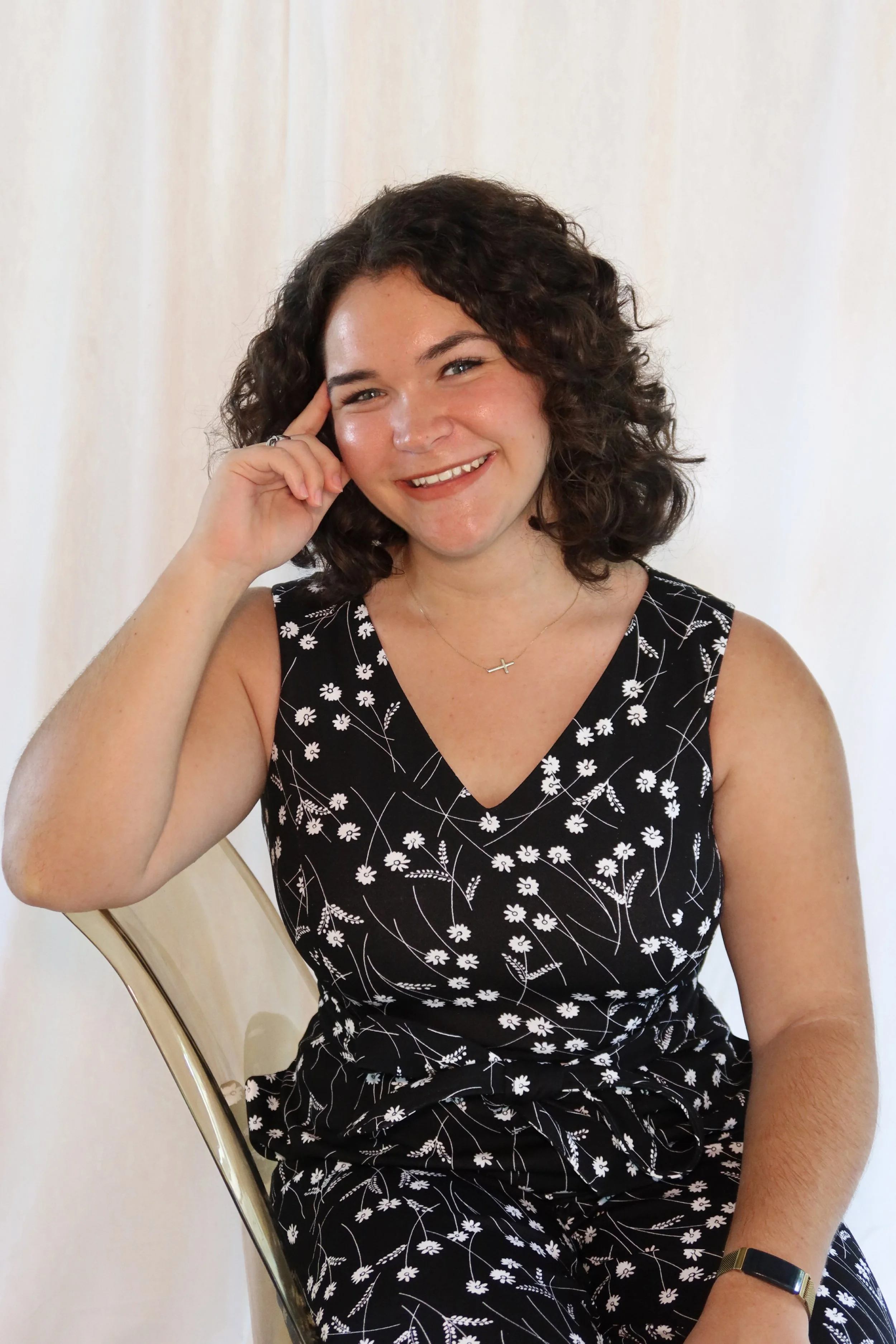 Young woman with curly brown hair smiling, wearing a black sleeveless dress with a white floral pattern, sitting on a gold-colored chair in front of a white curtain.